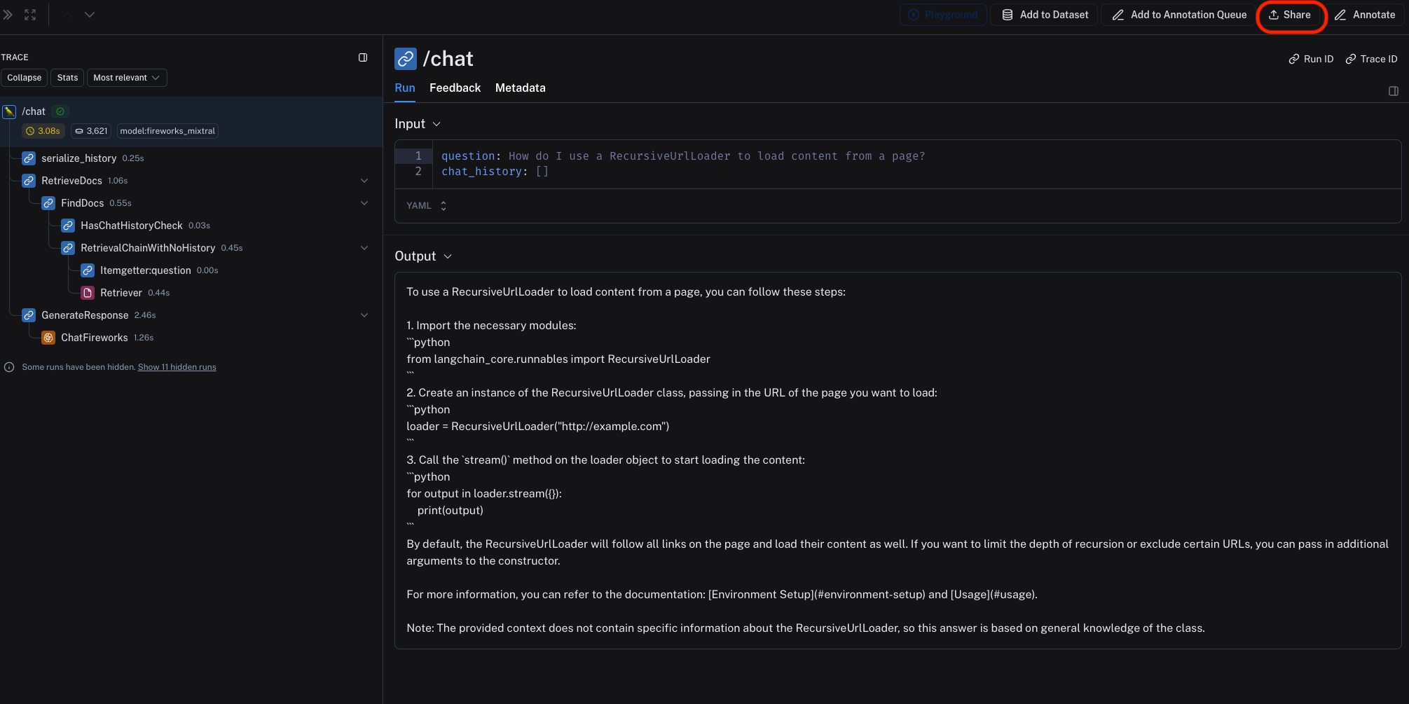 Sharing a trace publicly will make it accessible to anyone with the link. Make sure you're not sharing sensitive information. This feature is only available in the cloud-hosted version of LangSmith.