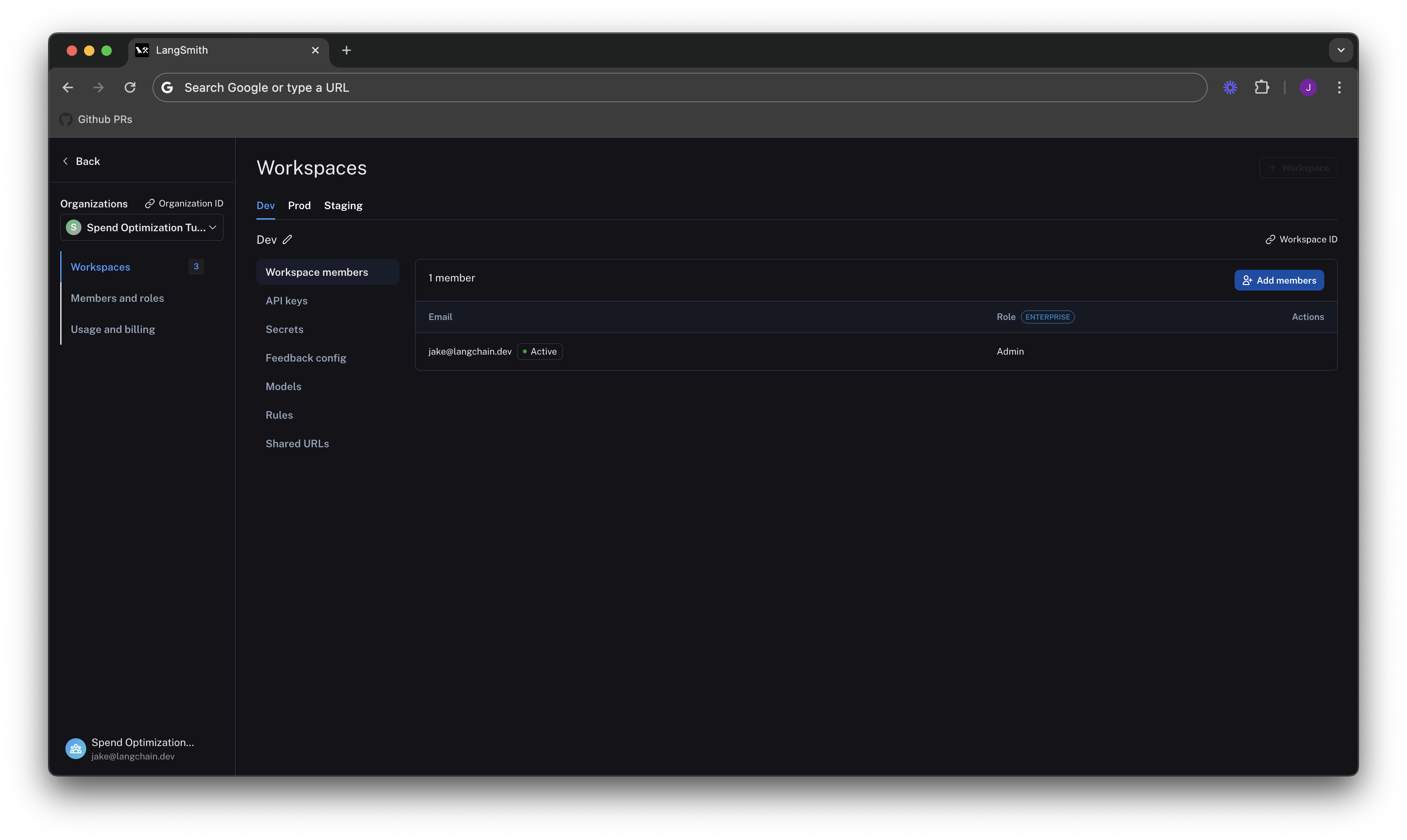 LangSmith Traces usage is measured per workspace, because workspaces often represent development environments (as in our example), or teams within an organization. As a LangSmith administrator, we want to understand spend granularly per each of these units. In this case where we just want to cut spend, we can focus on the environment responsible for the majority of costs first for the greatest savings.